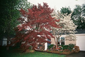 Being home today brought a sense of belonging. I am rarely home, and it was wonderful to be here. “Home is where the heart is” as the saying goes. I took a stroll around the yard checking the greenhouse plants that now make home here. They like it here! They nestle between trees and shrubs and in our lime green screen house. The beautiful Japanese maple and dogwood trees in the photo below provide shelter so filtered sunlight peeks between the lush leaves, perfect for the red leaf philodenrons and ferns.