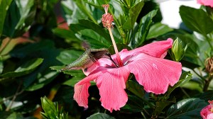Our tall pink hibiscus seems to attract the male ruby-throated hummingbirds in her new home! Why not, she is gorgeous! In the short time we are home today Dean & I have not seen the territorial rights being displayed amongst the male hummingbirds. This will take place, if it has not already. I know her nectar is sweet, but there are plenty of blossoms to share guys!