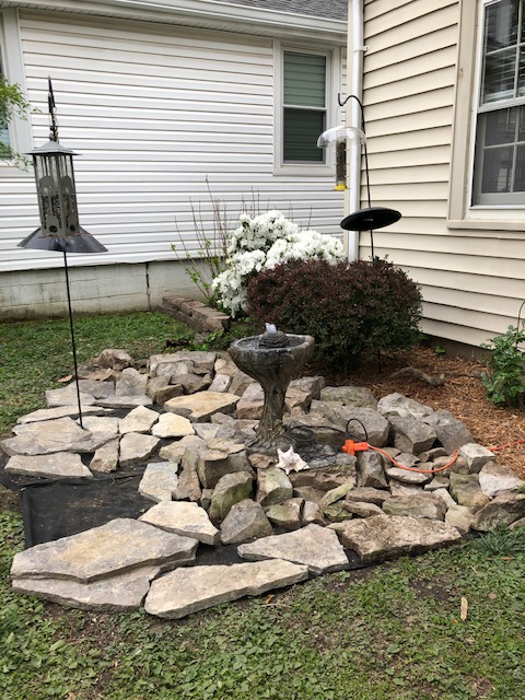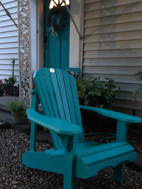 Every year we enjoy feeding the neighborhood songbirds. Early spring Dean & I added a bird bath/fountain we found “on sale”. Funny how “a bargain” multiplies 1 major project x 5. Dean resurrected nearly buried rocks from the alley area out back to create a rock garden for under the bird feeders & fountain nearby our living room window. It took us 8 hours to piece together the puzzle of mossy rocks & purchased flat stones. We also built our pebble patio in the front situated under the dogwood tree. For our outdoor seating pleasure Dean assembled & painted 2 wooden Adirondack chairs dubbed “the bear chairs” as they are made by The Bear Company. The chairs’ color nicely matches our “nifty turquoise” front door. It is such a peaceful sanctuary under that dogwood tree. Well, until the neighborhood Cooper’s hawk comes for a visit. The birds chatter & squawk until the bigger bird of prey flies away with or without lunch. We finished out our warm season projects with a new retaining wall between our house & the church next door, then mulched between the flowering hydrangeas & peonies.