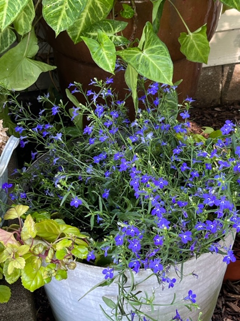 This morning I walked 4 blocks to attend church at 7:00am and it already felt like a sauna. It is not even officially summer, and it is 100 degrees at noon today! Heat index is expected to be 115 degrees! Clouds are starting to build up like an afternoon storm. Yet no promise of cooler weather until Thursday according to the weather folks. Yesterday Dean brought in a hydrangea bloom with hues of pink, purple, and blue within the one flower. A gorgeous display to brighten the bathroom. This morning the hydrangeas were perky and showy but are wilting with heat stress at this afternoon hour. I am glad I watered the potted lobelia, cherry jolt dianthus, and coleus. Tomorrow morn I will need to include the hydrangeas. And glass of iced tea coming for me …