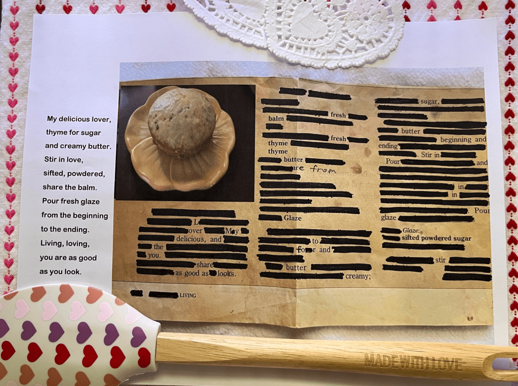 The workshop had two components. First, I taught the guests how to maximize flavor for a lemon-herb tea bread using three ingredients: the zest of a lemon, the juice, and lemony-type herb such as lemon basil, lemon thyme, or lemon balm. Second, I taught how to write a black-out or block-out poem using a recipe, magazine article, or page from a book. The example I shared was the prize-winning Valentine poem I wrote to my Dean using words from the lemon-herb tea bread recipe. Poems’ words are concise, and the guests learned the process of picking out descriptive words from their selected article or recipe. One guest shared her poem eloquently written in honor of a young man who was recently killed an motorcycle accident. The words chosen came from a magazine article on different types of lavender. The words seemed appointed for her to write. It was a beautiful experience for her, the rest of the workshop guests, and me.