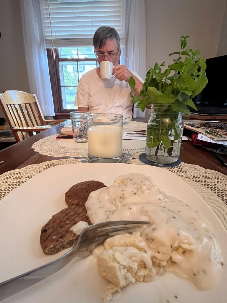Summer can bring a frenzy of activity like the hummingbirds with their multiple flights to the sugar-water feeders. Dean is filling those feeders with his homemade recipe every 7 – 8 days. The finches and sparrows are the same with the suet blocks we put out. Fattening up, those birds of song. Summer blooms and songs all around. I read about blackberries, bees, and honey. I sit, observing from our cottage’s windows, taking it all in this week while recovering from COVID. This morning, I am feeling well enough to walk outside in the midst of the sights and sounds. Sunday’s sermon will be given courtesy of Mother’s Nature. The biscuit & gravy chef made a plate for me this morning. My last day of quarantine will be a beautiful one. How blessed I am.