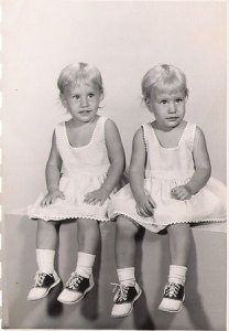 My identical twin sister and I are close in many ways.  Of course, we are close in age.  But our looks, height, weight, markings, hair color, skin color, etc are very close as well.    Those young childhood years we were instant playmates.  Though during the junior and senior high school years we developed our own interests and friendships.  So many personality traits are different.   Yet we share a common interest in organic gardening, art, and the simplicity in living as mature adults.  There is a close, understood  bond with twins.  And as we get older, this rings true in our relationship.  Here we are, my twin sister Margie & I at age 2.  I would love to hear your twin story.
