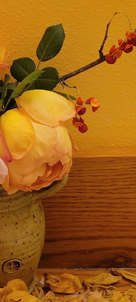 Our perennials grew lusciously this summer, such a long summer season with rain. Our showiest pot is a Kingston fern with a philodendron planted together in April. I trimmed that thing three times already! Now gathered greenery fills our basement under the plant light tonight, their home for the next 5 months. I need to harvest the lasting herbs of mint, thyme, basil. oregano, and parsley, so the pots gather on the kitchen counter for tomorrow’s project. Our last single ketchup and mustard rose gets snipped and put into a bud vase to treasure just a few more days indoors. My northern friend shares her last rose in an amber vignette saved before Minnesota’s killing frost.