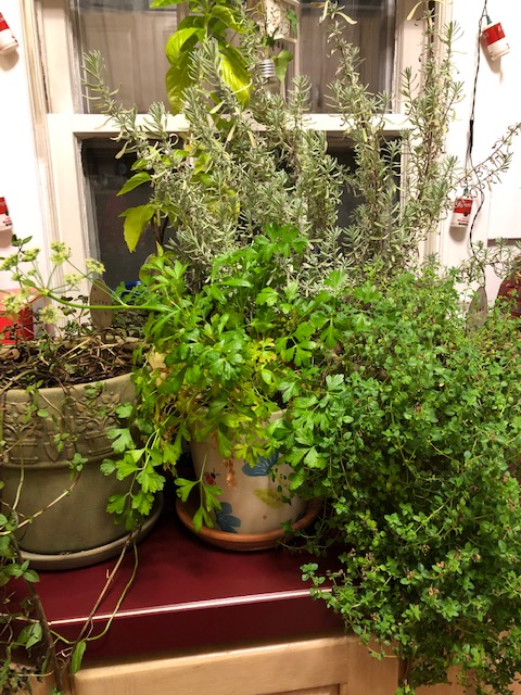 This past weekend Dean and I brought out our perennials from their winter shelter and into the wilds of Missouri springtime. The air has been warm, but the wind brutal these past few days. The young sprouts on our 6-year-old lantana plant were wind whipped, so I trimmed that back hoping it comes to bloom beautifully like it does each year. My herbs from last year did not make it through the winter in their basement home. Therefore, we made a trip to purchase fresh herb plants from the neighborhood greenhouse. Tai and Genovese basils, lemon thyme, broad leaf and pineapple sages, oregano, chives, and mojito mint now grace the porch pots this growing season.