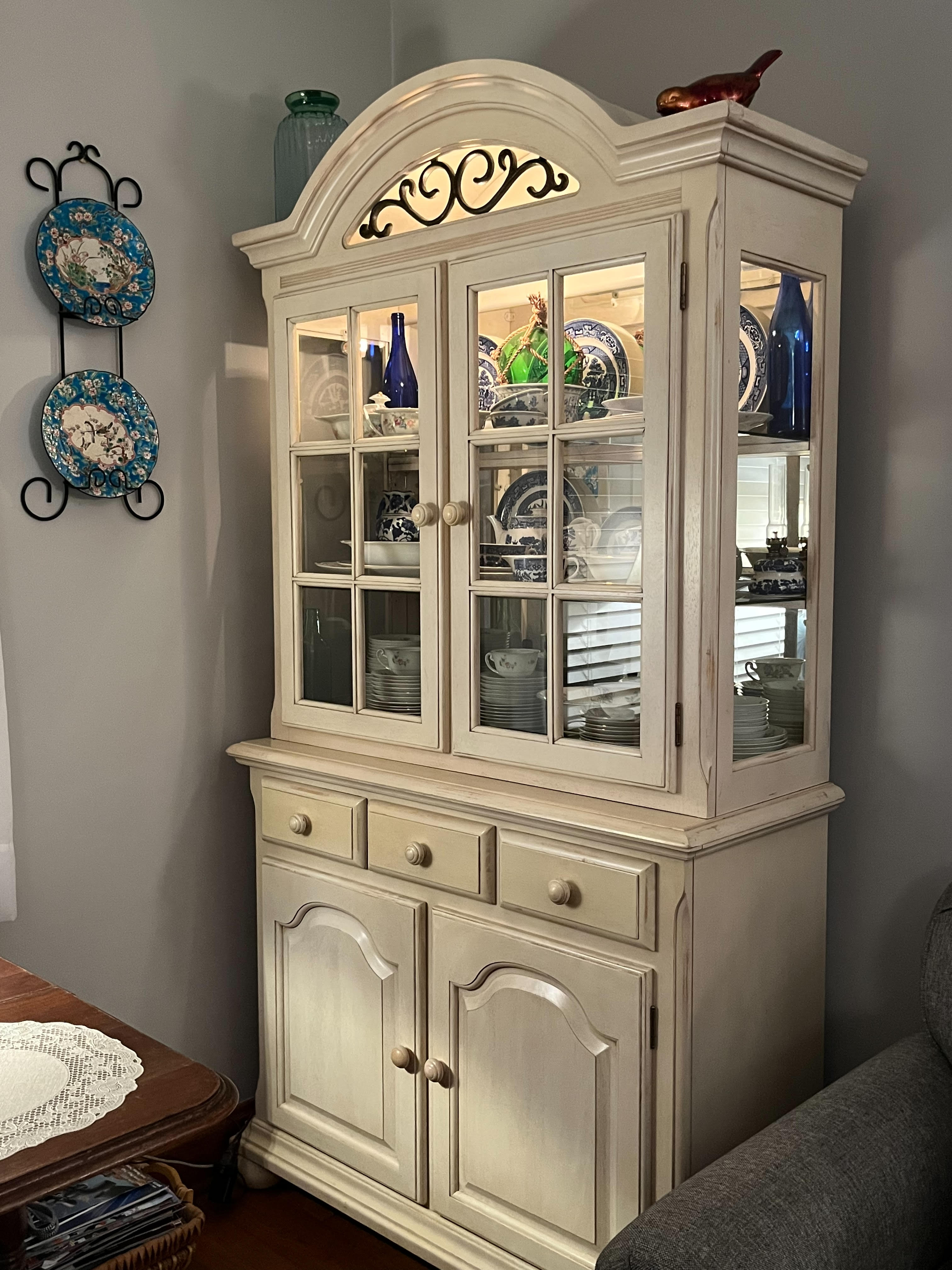 Our cottage home has come by some spring cleaning and sprucing up, too. We added a furniture piece to our living room. My mother’s china hutch came out of storage in our rental house’s garage, wiped down sparkling clean the glass panes and mirrors. With careful selection of items from Dean’s parents’ home, we uncovered boxes of his grandmother’s china and brought those home after our last trip there. We cleaned these circa 1930 pieces and placed in the hutch as well as my grandmother’s china and my mother’s Blue Willow collection. The glistening glass antiques have given an extra touch of warmth and nostalgia in our small abode.