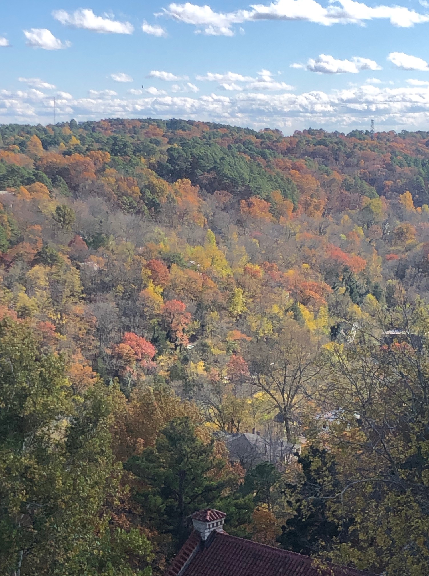 Dean and I got away this weekend. While in route to a countryside Ozark destination we talk on the telephone with our son and 7-year-old granddaughter. She asked, “getting away from what?” Good question. The answer is “everyday life”. Do you ever need a reset button? Take a couple of days away from your own four-walls and neighborhood. Just the drive southward I felt like a load taken off my back and feet. Being in new scenery did wonders. Cobwebs are cleared out of the brain. Breathing fresh air instead of the stifling stagnate vapors. Sleeping is allowed with no schedule to keep. The body is rested. Hot beverages sipped while conversations are simple and sweet. Kissing is easier, intimacy is reveled. Listening to poetic words shared in a quaint setting is like a snug quilt. The writing pen flows as the wind does. God’s grace was given these autumn days in the Ozarks.